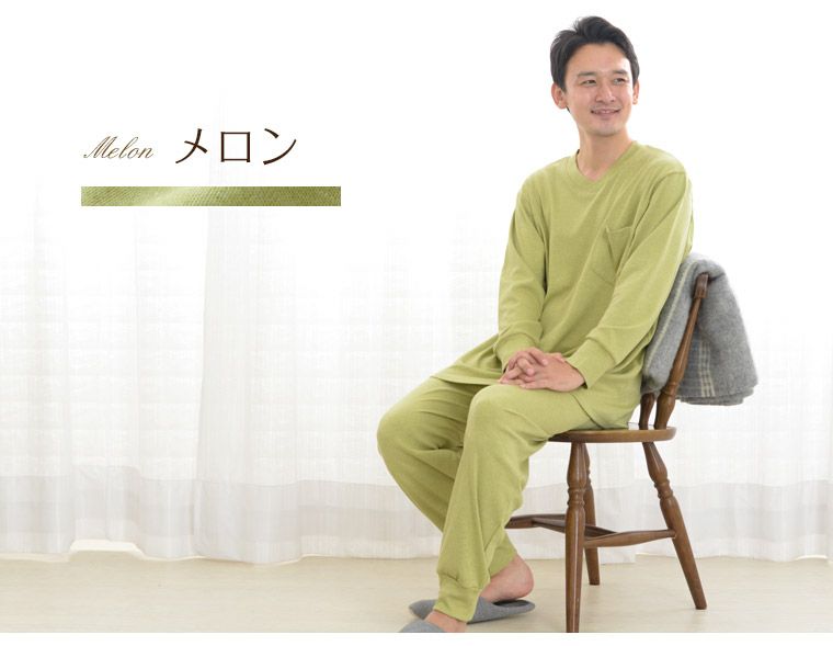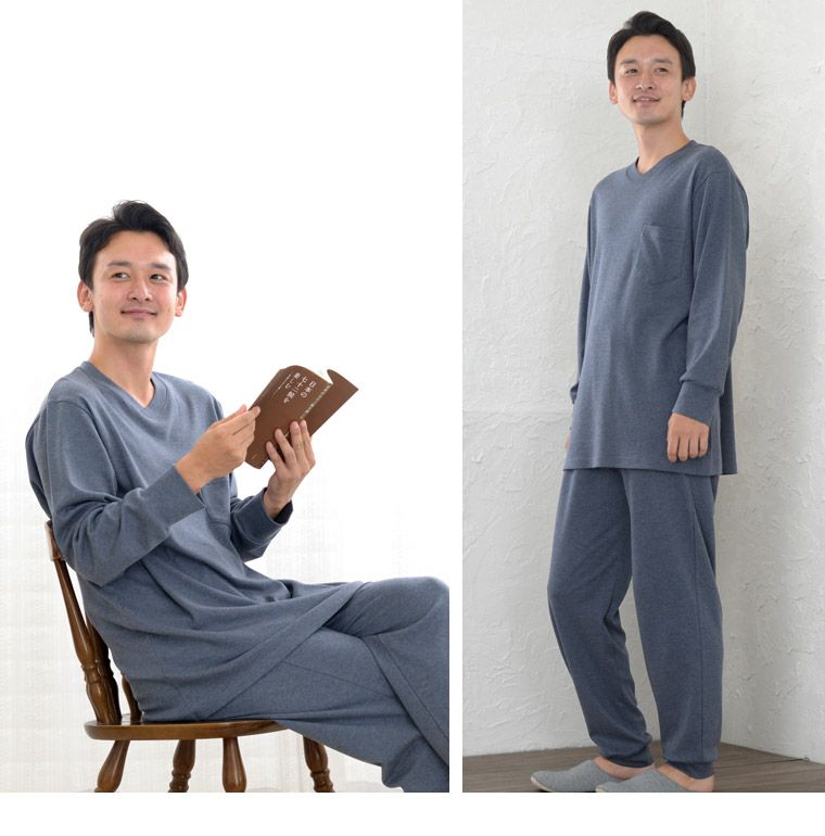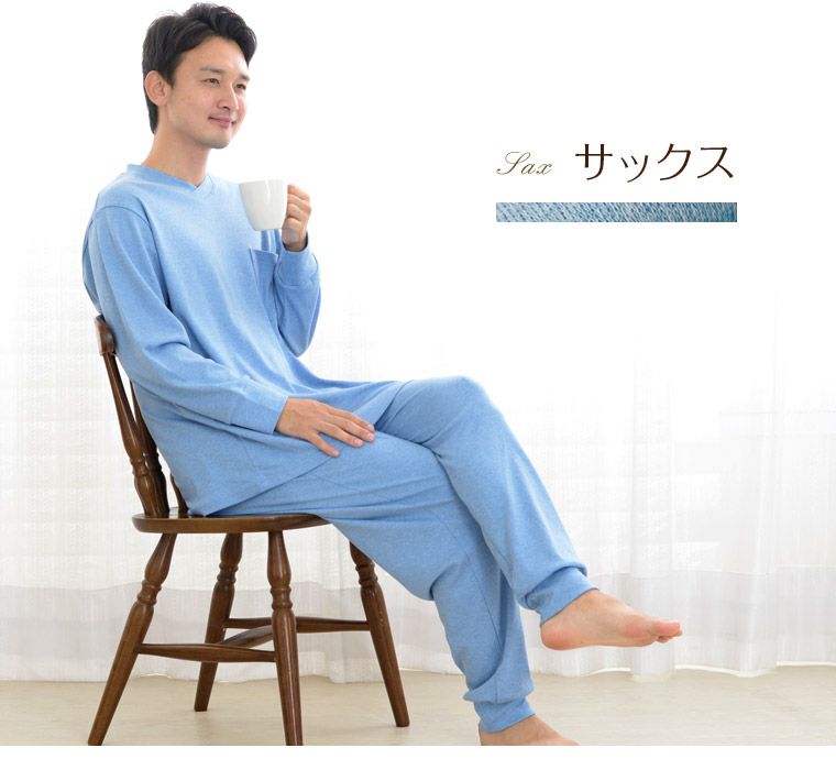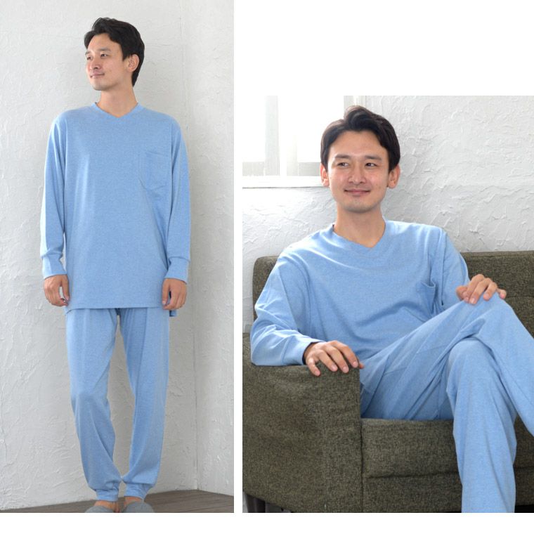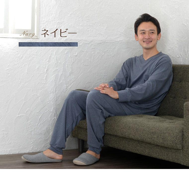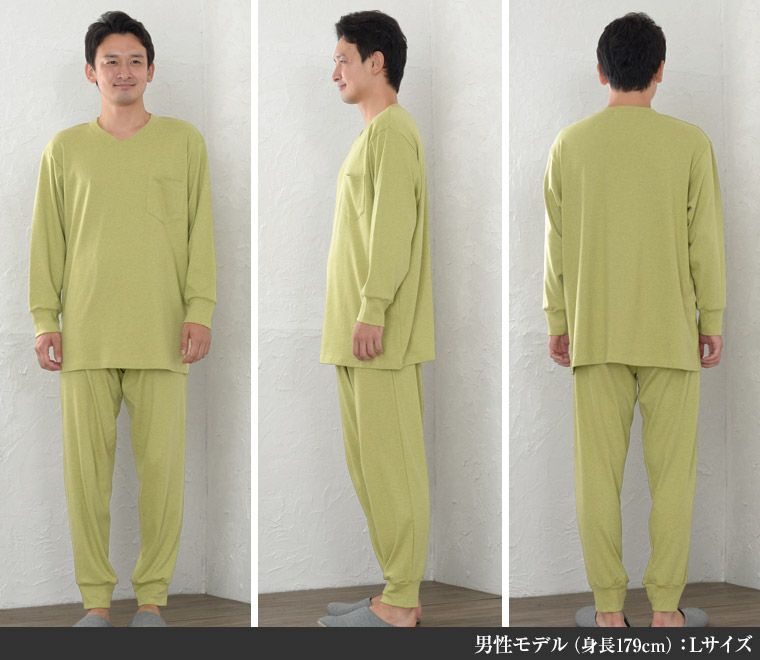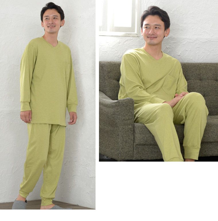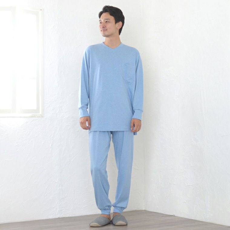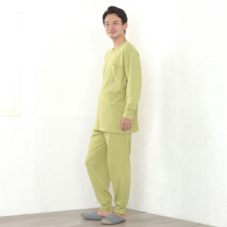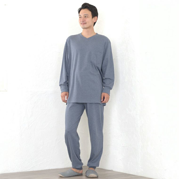 綿100% オーガニックコットン中厚スムースニット 長袖 メンズVネックパジャマ