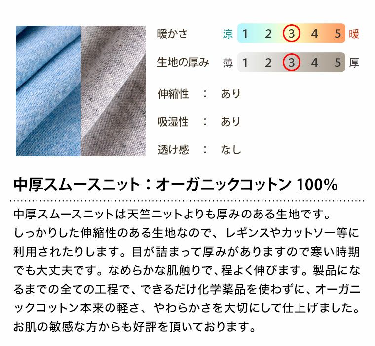 通気性や保湿性、保温性に優れた中厚スムース生地。 長いシーズンで活躍してくれます。