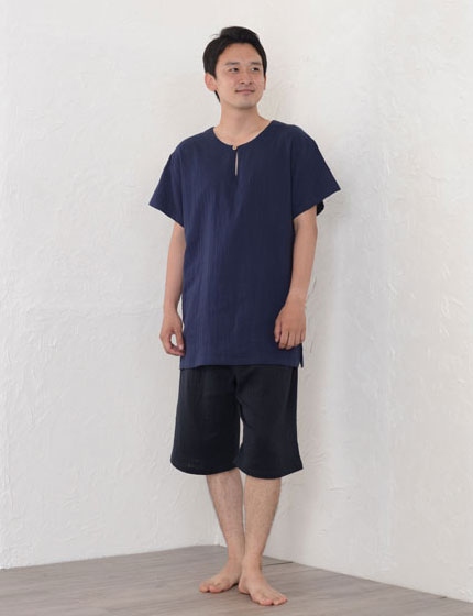 ネイビーのガーゼパジャマにブラックのスペアパンツ。
