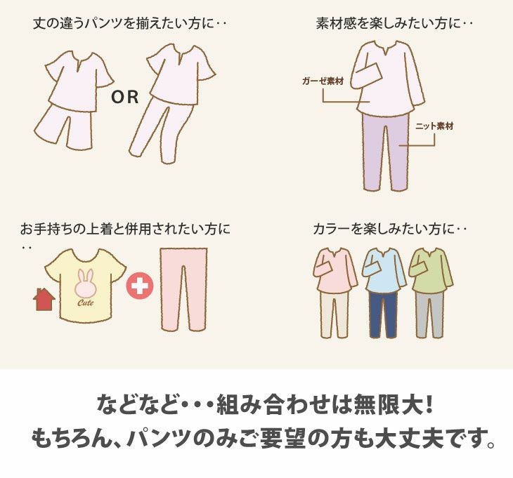 上下カラーを変える、短いパンツを長いものに変える、スリーパーやネグリジェにパンツを合わせる等、使い方はいろいろ!