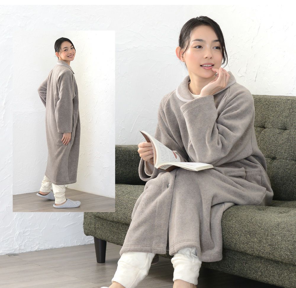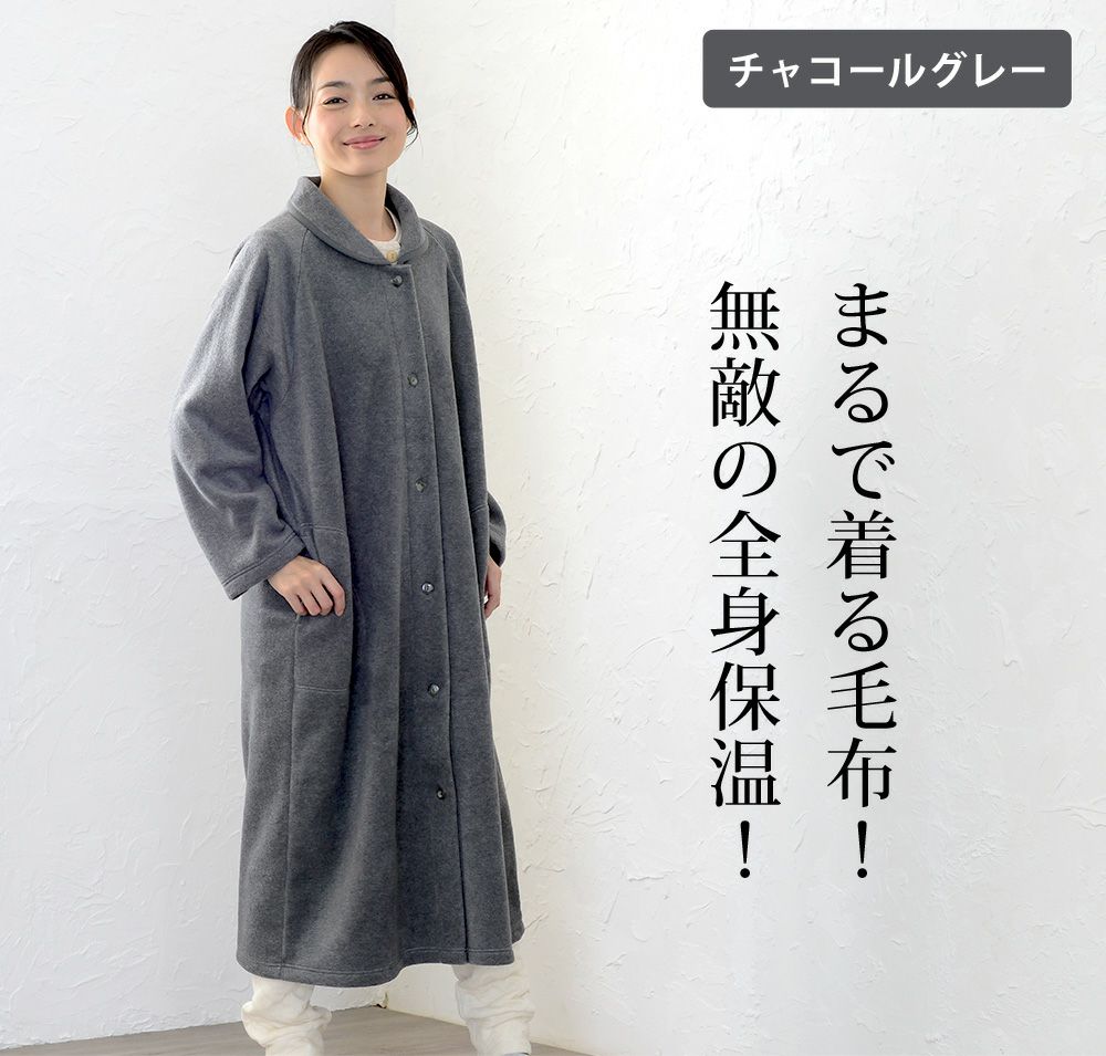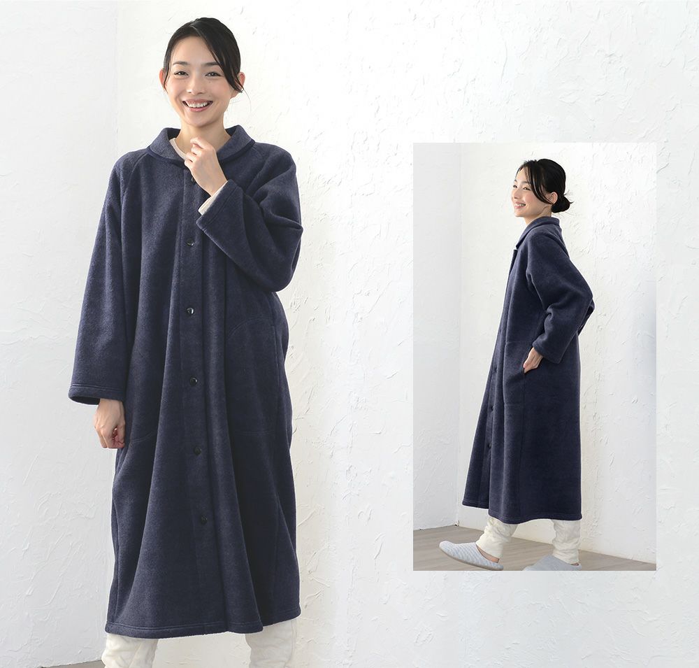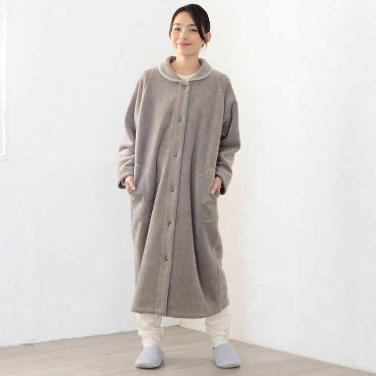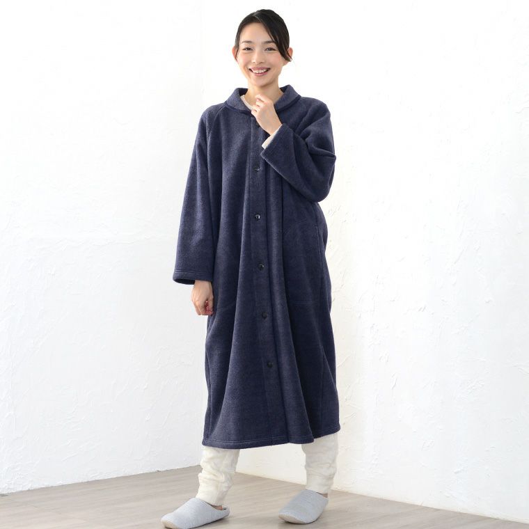 レディース ロングガウン 長袖 前開き 衿付き メルトンフリース 0916