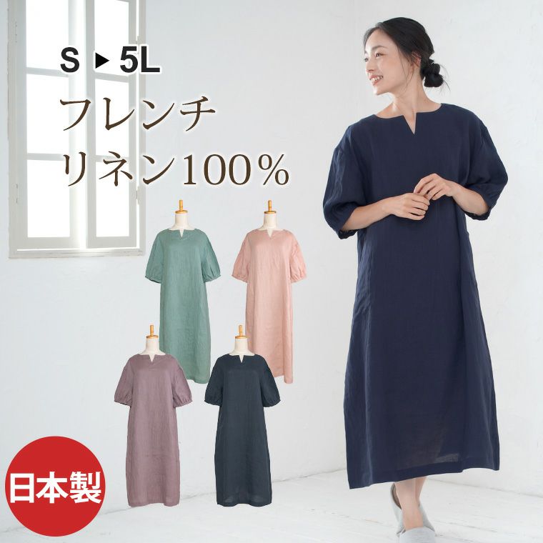 レディース ワンピース 五分袖 かぶり キーネック 麻100%(フレンチリネン) 0763