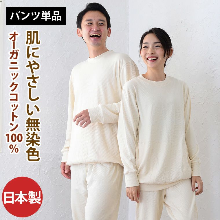 こちらの商品ページは、オーガニックコットン無染色接結ニット 男女兼用かぶりタイプパジャマ(19131220)のスペアパンツ単品販売のページになります。