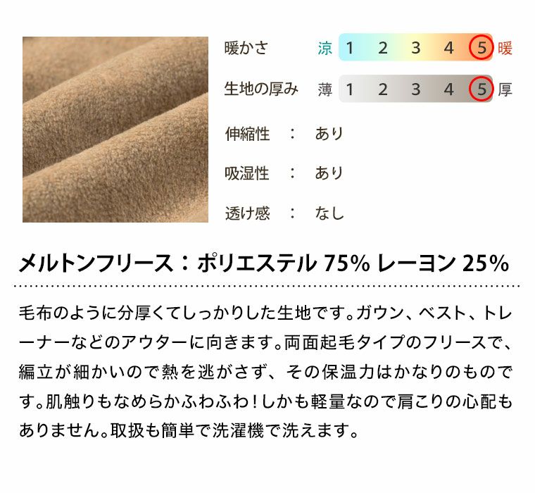 フリースはポリエステルでてきている化学繊維です。 しかし綿素材よりも保温性が高く、冬の防寒対策といえばフリース、と言われるほどに、認知性は高まってきました。 パジャマ工房では数種類のフリースをご用意しています。それぞれ厚みが違いますので、用途に応じてお選び下さい。