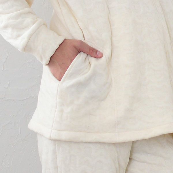 生地の間に極細ポリエステル糸をはさみこんでいるので、フリース並みの保温力があります。吸湿性、放湿性に優れた天然素材ならではの不快感のない自然なあたたかさ。化学繊維ではなく天然繊維でしっかりあたたかい素材をお探しの方にオススメです。