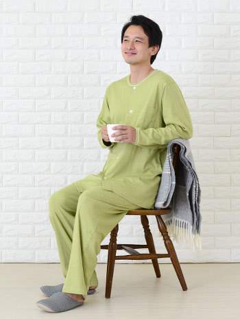 当ショップのオーガニックコットンパジャマの中で最も肌に優しいパジャマ。ふわふわの無染色・天然染色オーガニックコットン接結ニットでお作りしています。身体にいいもの 安心で安全なものへのこだわりから生まれました。 二枚の布を重ねた接結ニット素材なので、生地と生地の間に空気の層ができ、あたたかさを逃しません。